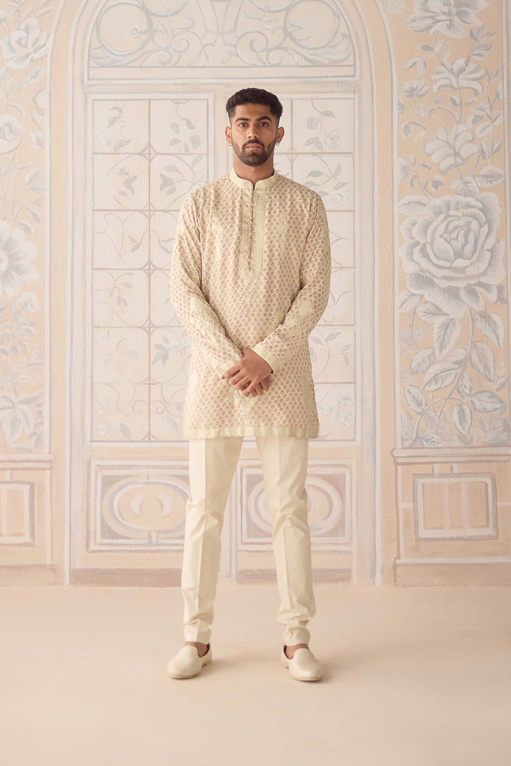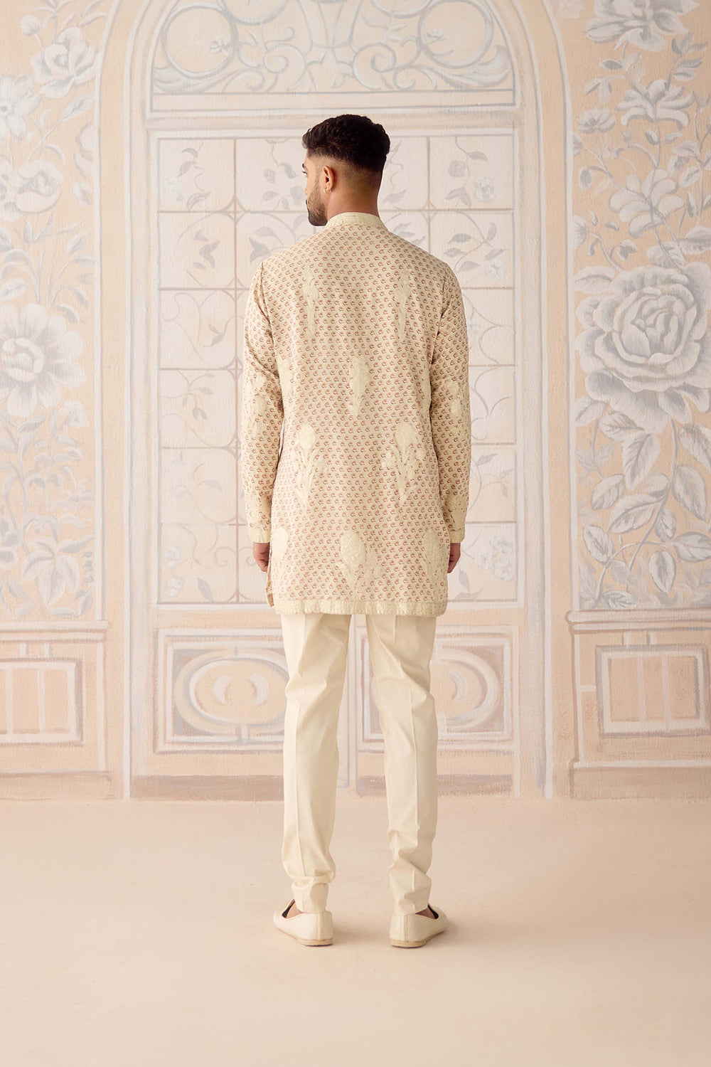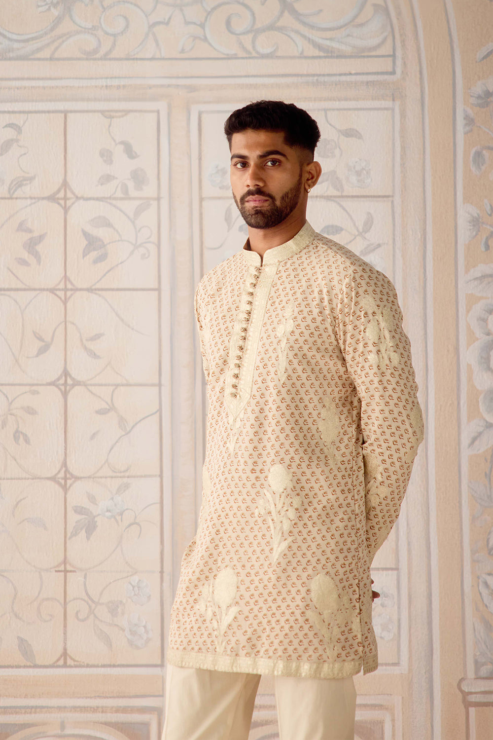 Antique white hand block embroidered gold appliqué and thread embroidered kurta set.