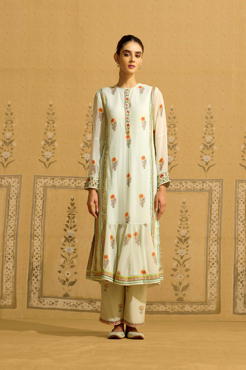 Hand block printed and zardozi embroidered silk georgette long kurta set with printed pants.