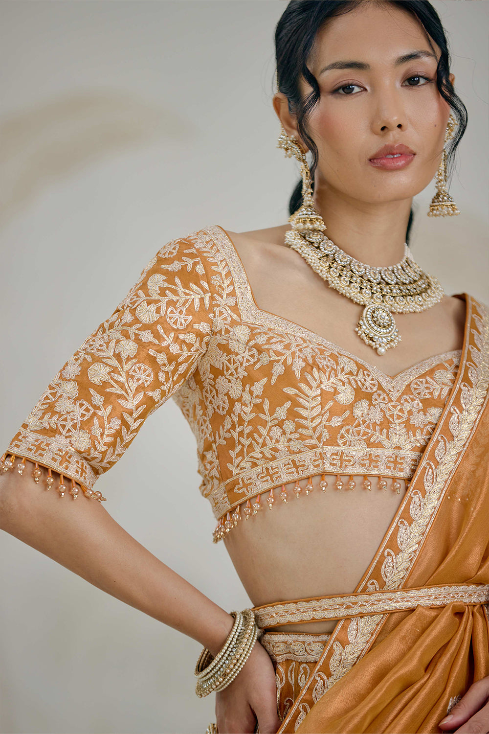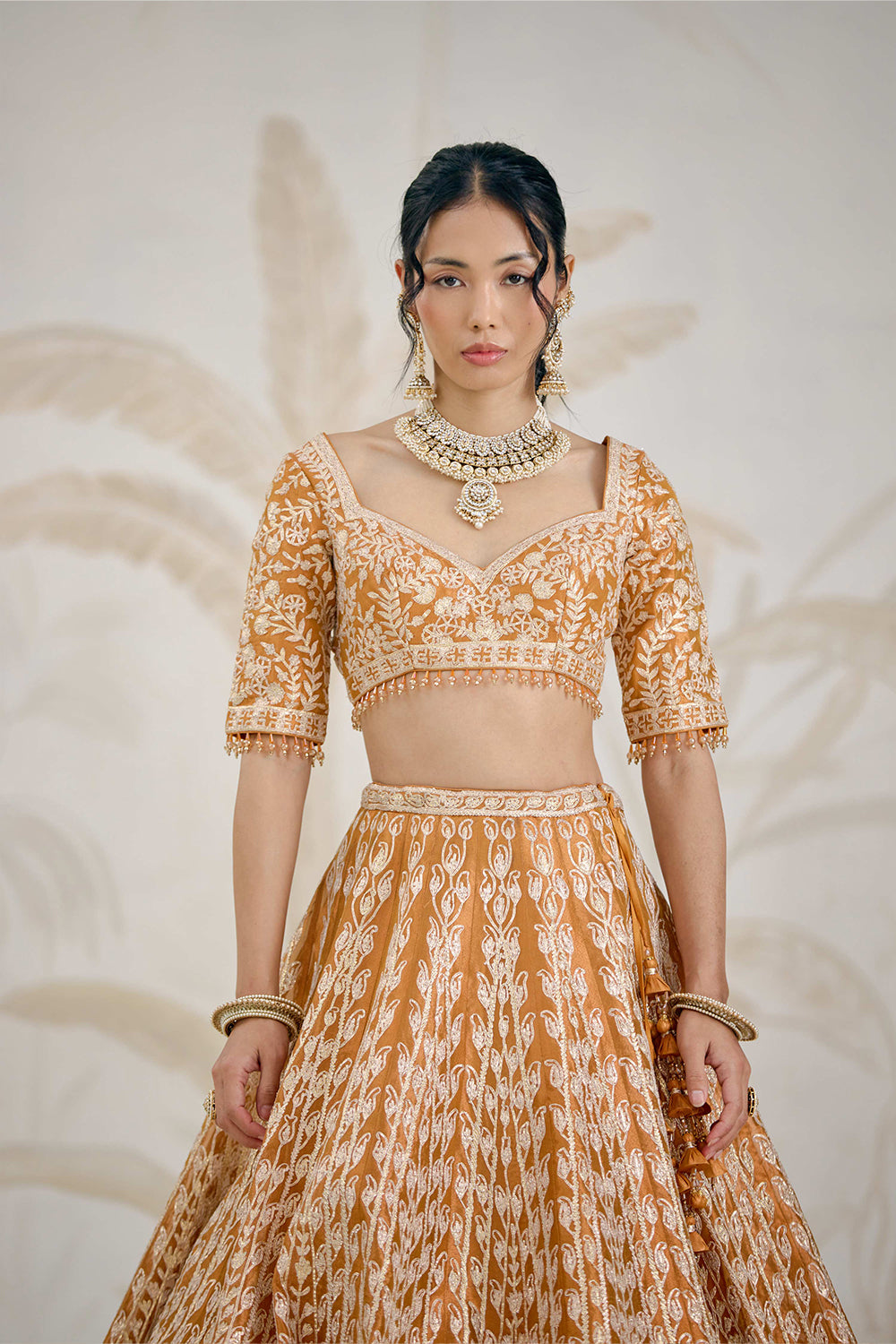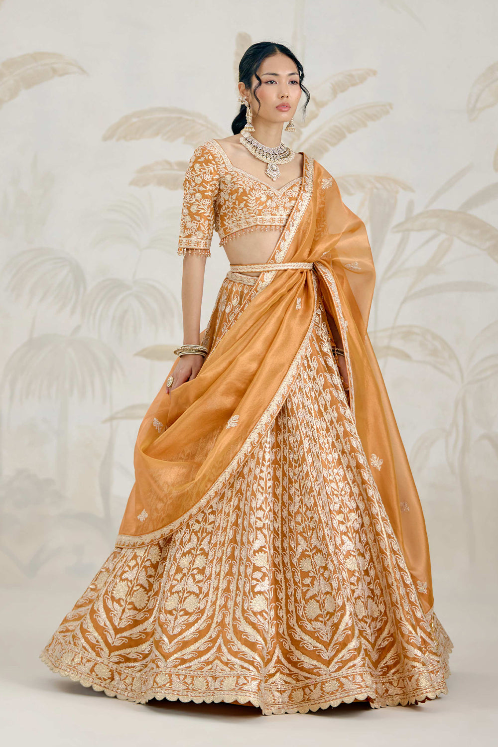 Gota embroidered tissue organza burnt orange gold lehenga set.