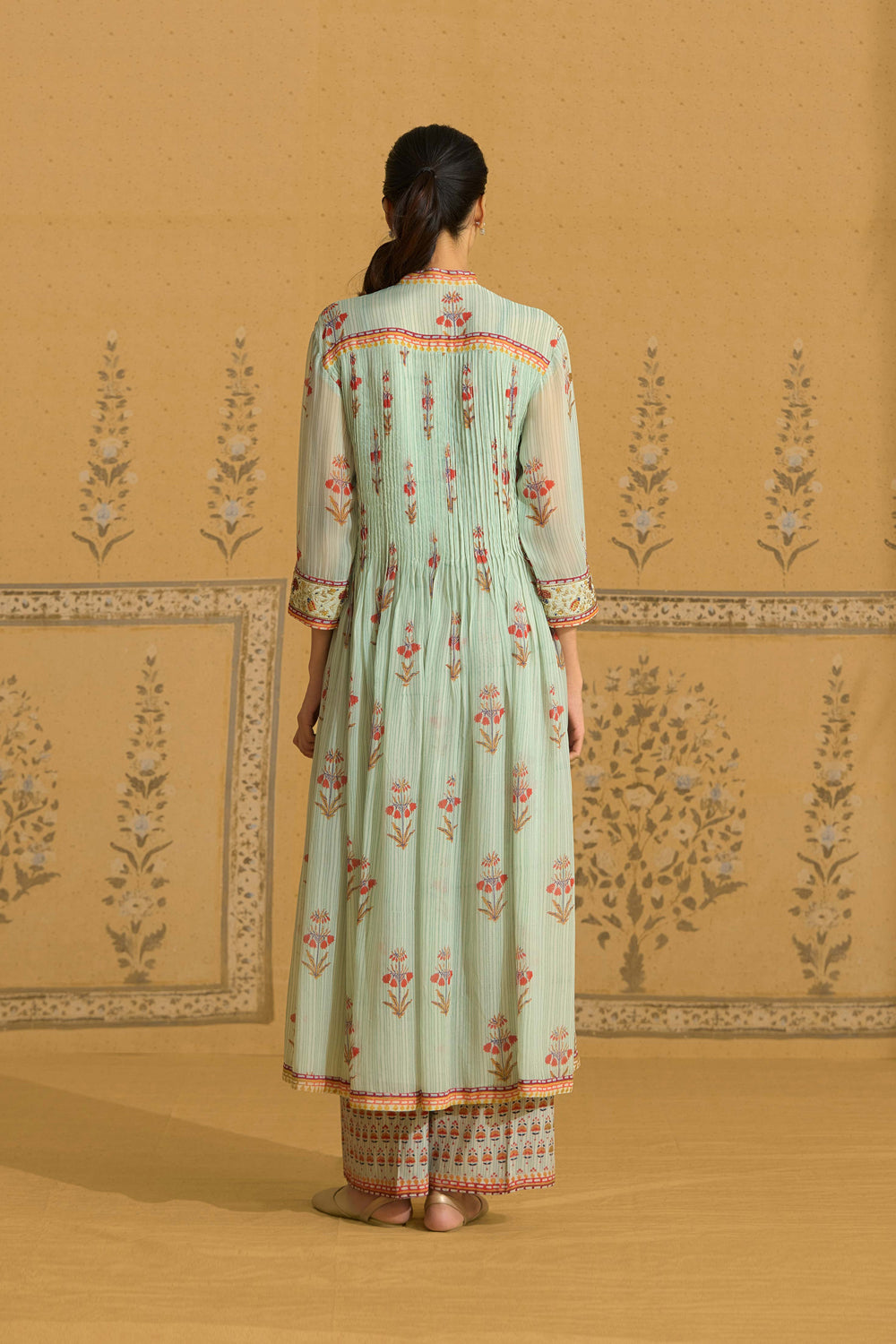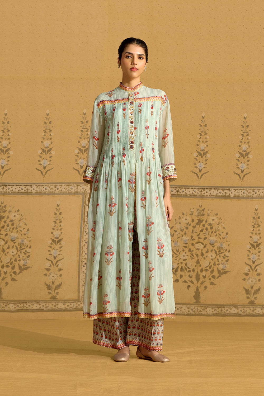Hand block printed and zardozi embroidered silk georgette pin-tucked front open long kurta set with printed pants.