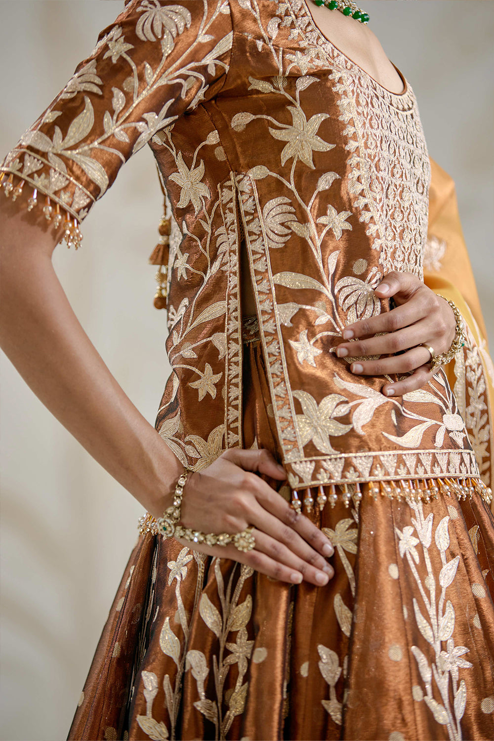 Gota embroidered tissue organza coffee brown/burnt orange lehenga set.