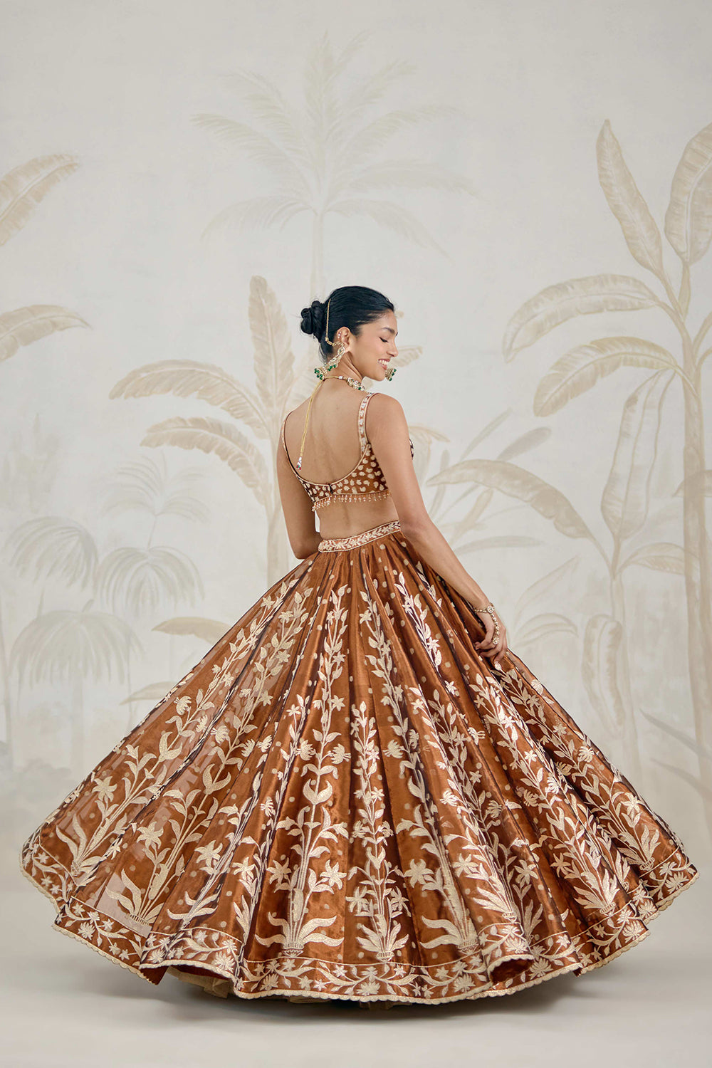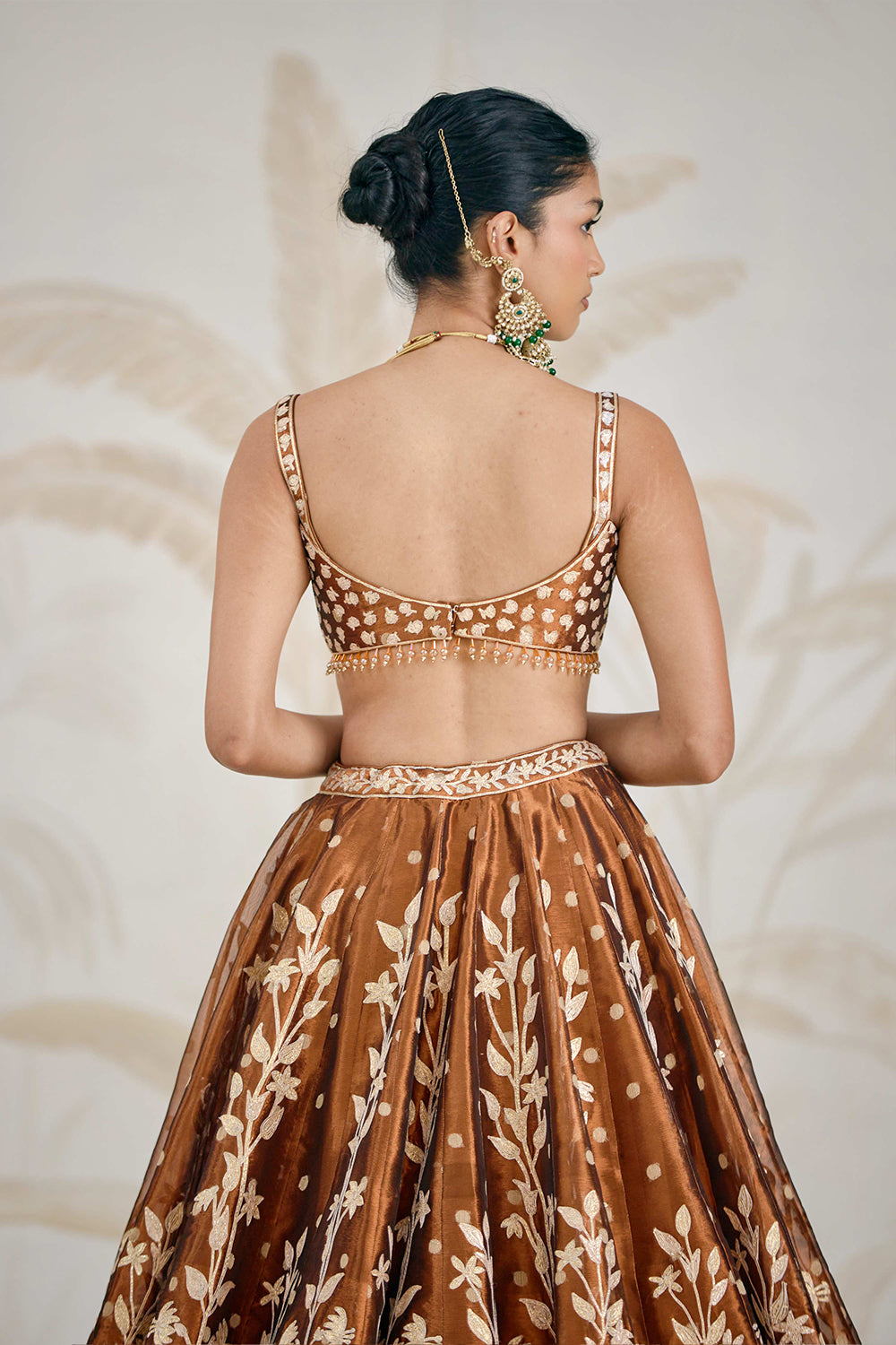 Gota embroidered tissue organza coffee brown/burnt orange lehenga set.