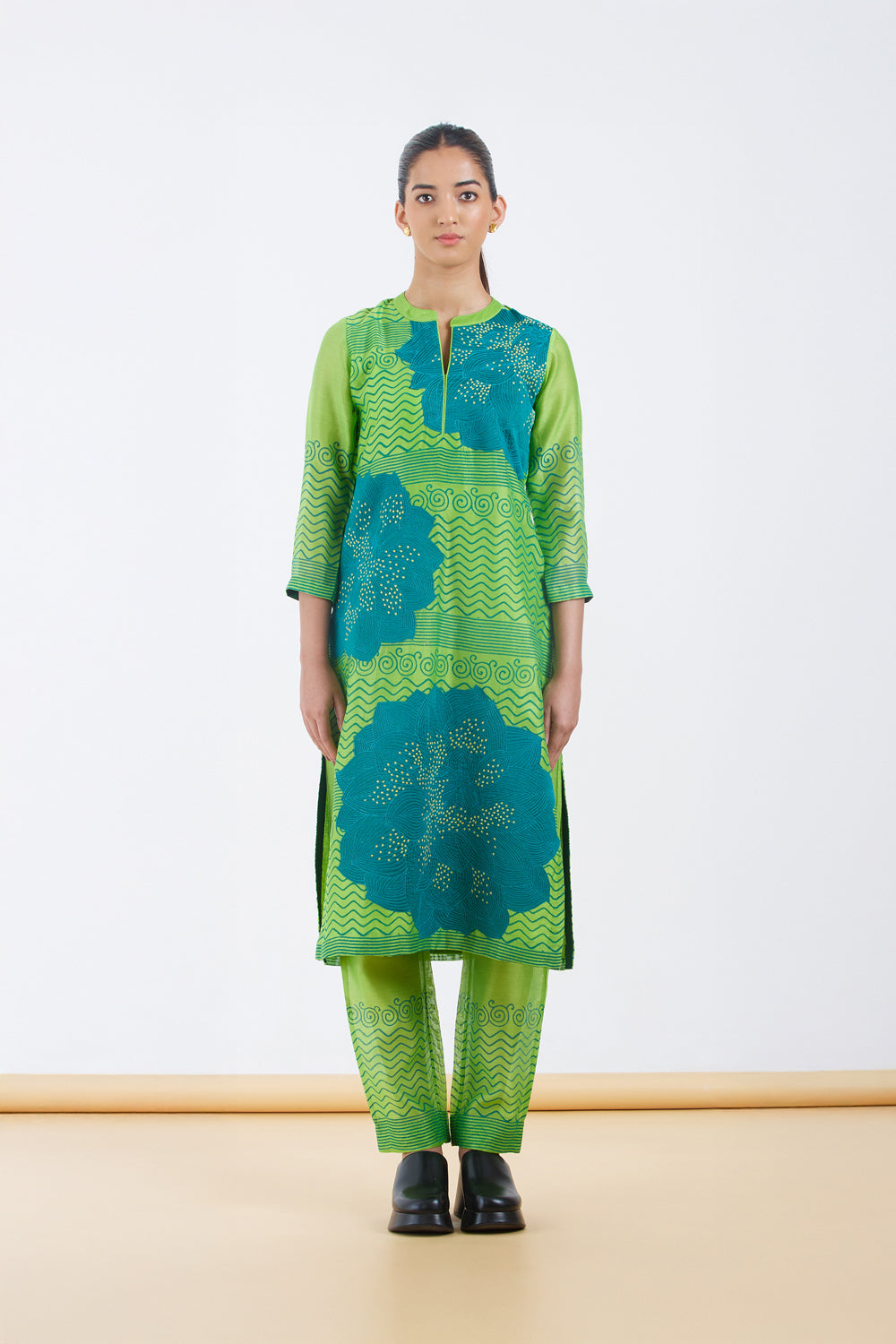 Silk Chanderi kurta set with block-print & multi-color. Patchwork outlined with resham thread work. Comes complete with block printed pants.