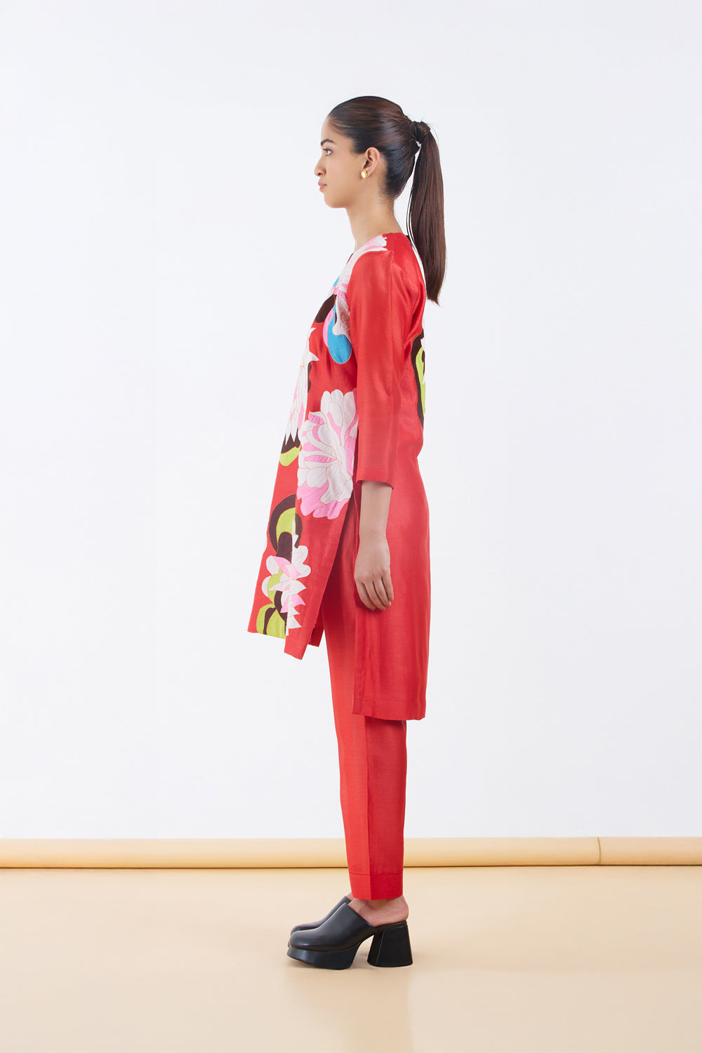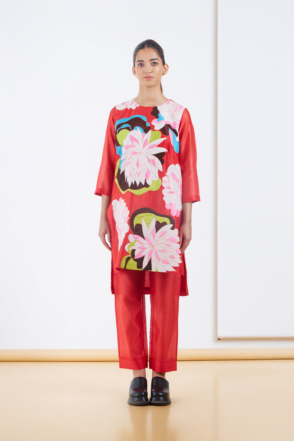Silk chanderi kurta set with block-print & multi-color floral patchwork outlined with resham thread work. Comes complete with block printed pants.