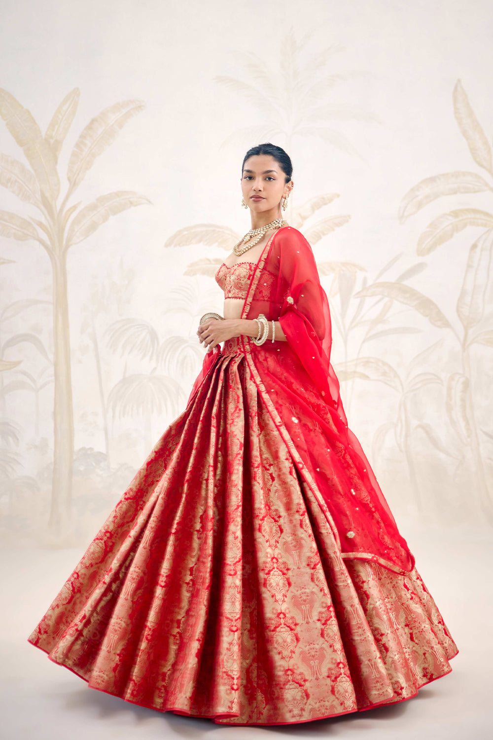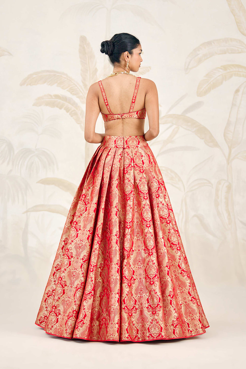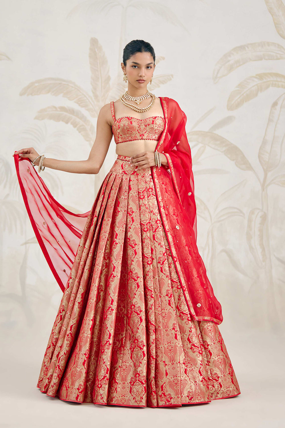 Banarasi silk brocade ribbon red pleated lehenga with zardozi embroidered silk organza dupatta.