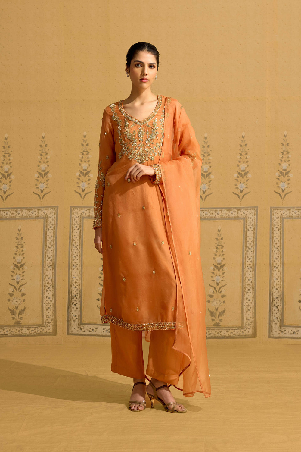 Zardozi embroidered silk organza kurta with pants and dupatta.