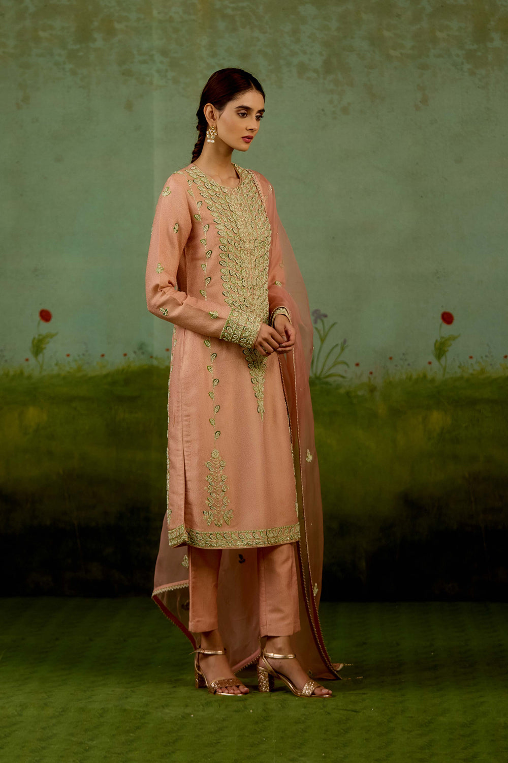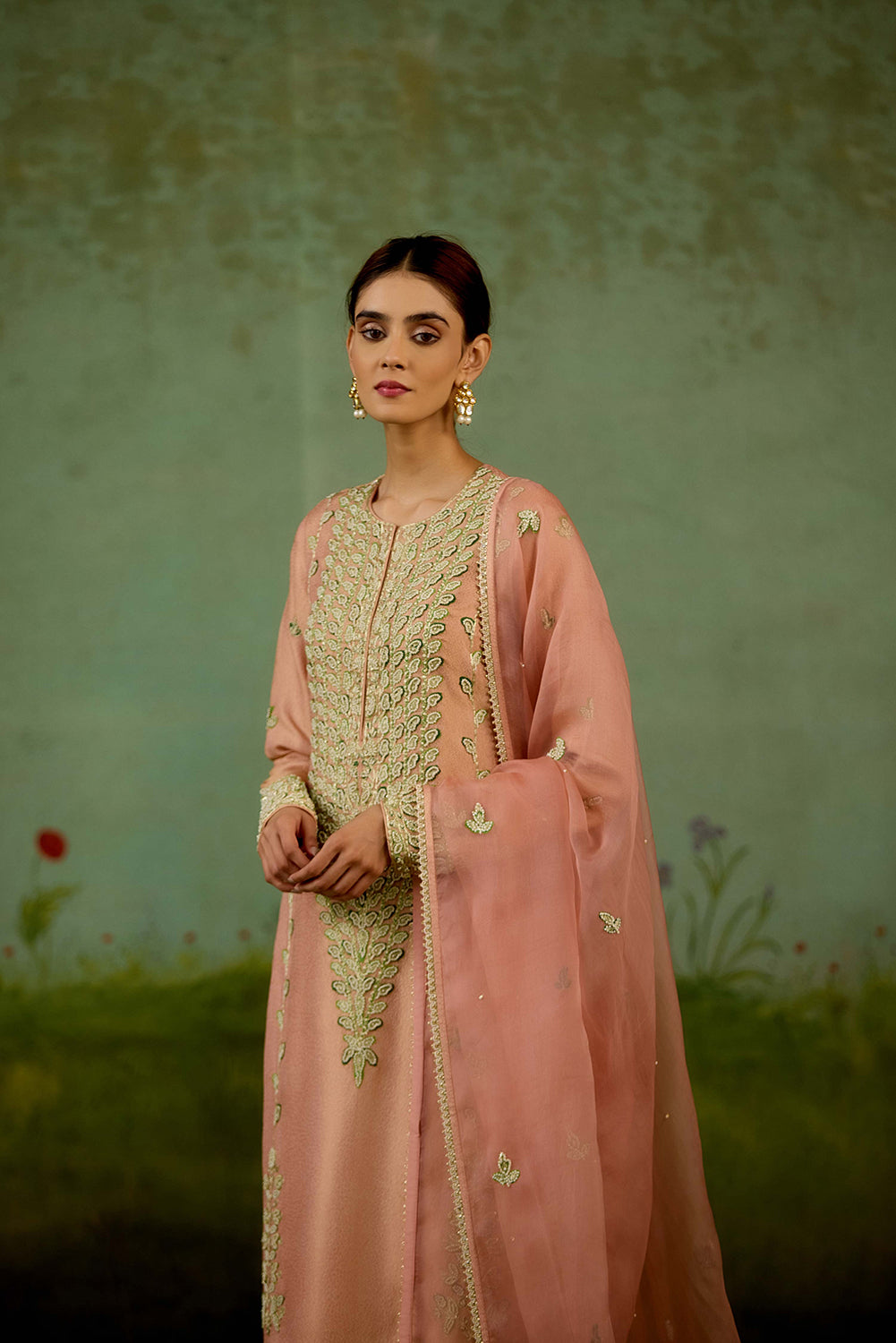 Zardozi embroidered Banarasi silk based kurta pant set with organza dupatta.