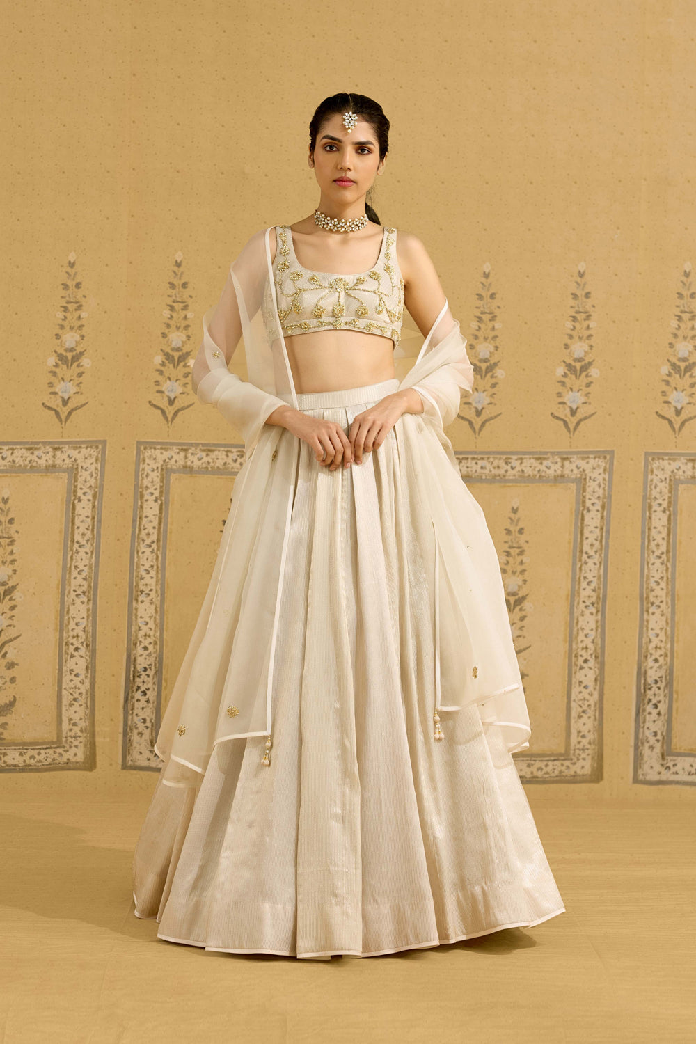 Zardozi and thread embroidered raw silk pleated brocade lehenga with organza dupatta.